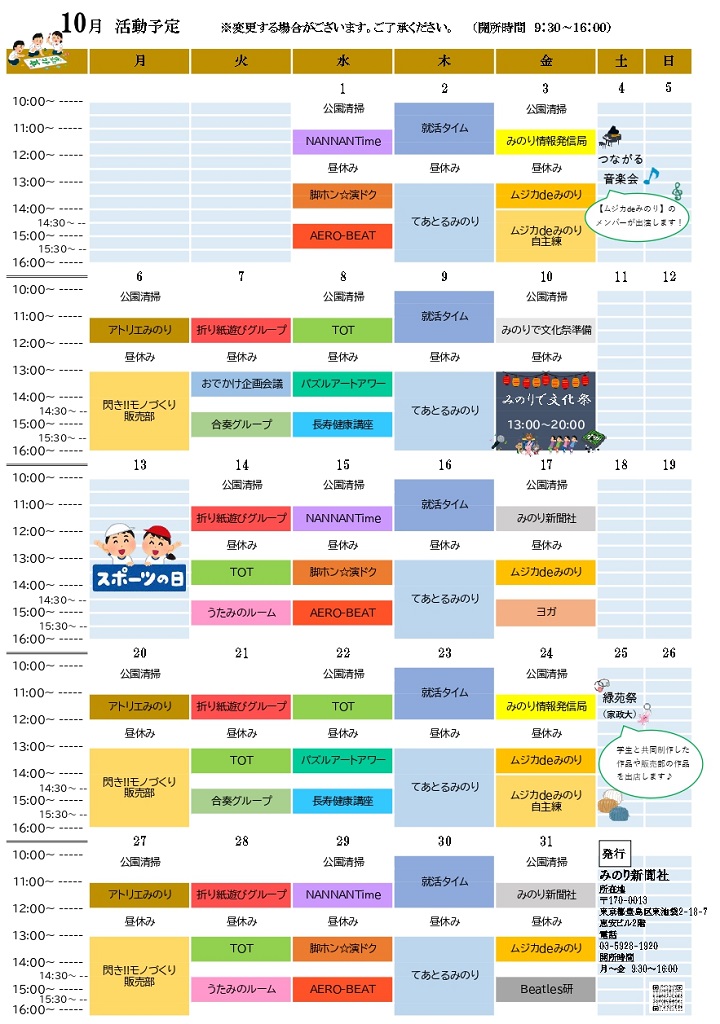 9月17日(水)…午前中は除草作業がありますがみのりは開所しています。 活動内容が変更される場合もございます。ご了承ください。 活動内容の詳細、ご見学のお申し込みなどは ハートランドみのり ☎03-5928-1920まで