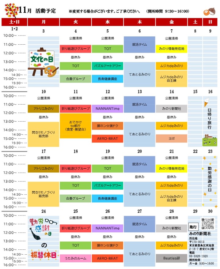 11月11日(火)…午後はお出かけグループで外出のため、みのりは開所しています。 活動内容が変更される場合もございます。ご了承ください。 活動内容の詳細、ご見学のお申し込みなどは ハートランドみのり ☎03-5928-1920まで