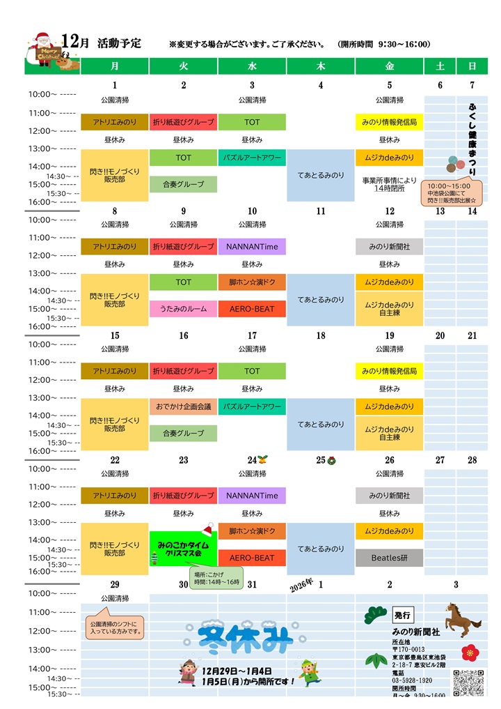 木曜日午前…定期開催の就活タイムは終了しました。閉所または不定期開所となります。 活動内容が変更される場合もございます。ご了承ください。 活動内容の詳細、ご見学のお申し込みなどは ハートランドみのり ☎03-5928-1920まで