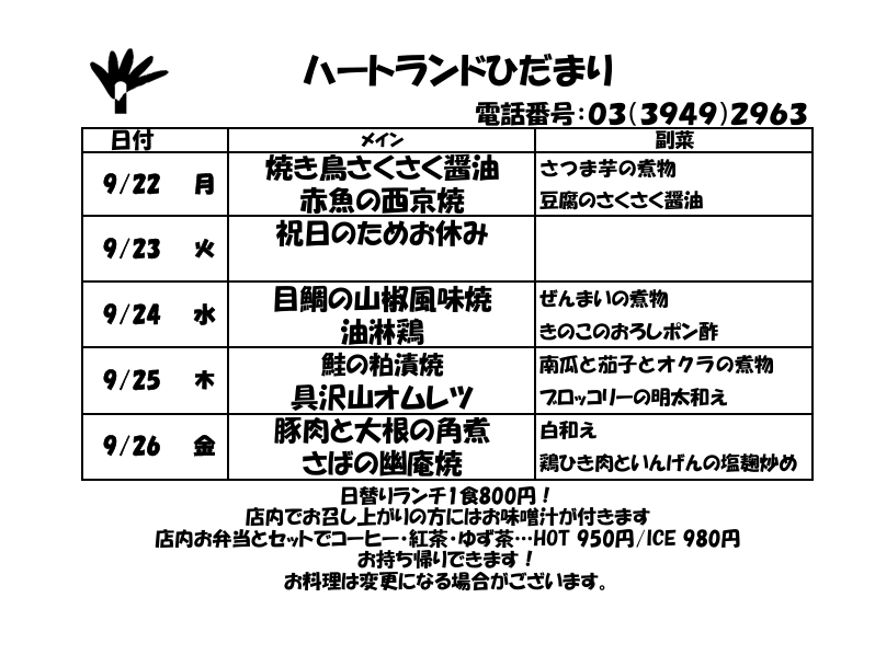 トップページ > 事業の紹介 > ハートランドひだまり > ひだまりランチメニュー