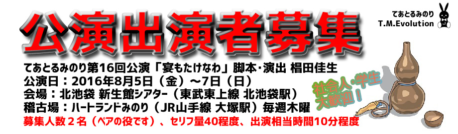 募集している人数は2名。90分近い物語の中で10分程度の出演になります(セリフ数は40個程度)。演劇関係者はもちろん、学生、社会人、フリーターなど、ご興味のある一般の方々も大歓迎です。初心者でも大丈夫です!稽古の曜日は基本的には木曜日昼ですが、19時から22時まで開催する夜間の稽古(T.M.Evolution)からの参加も可能です。